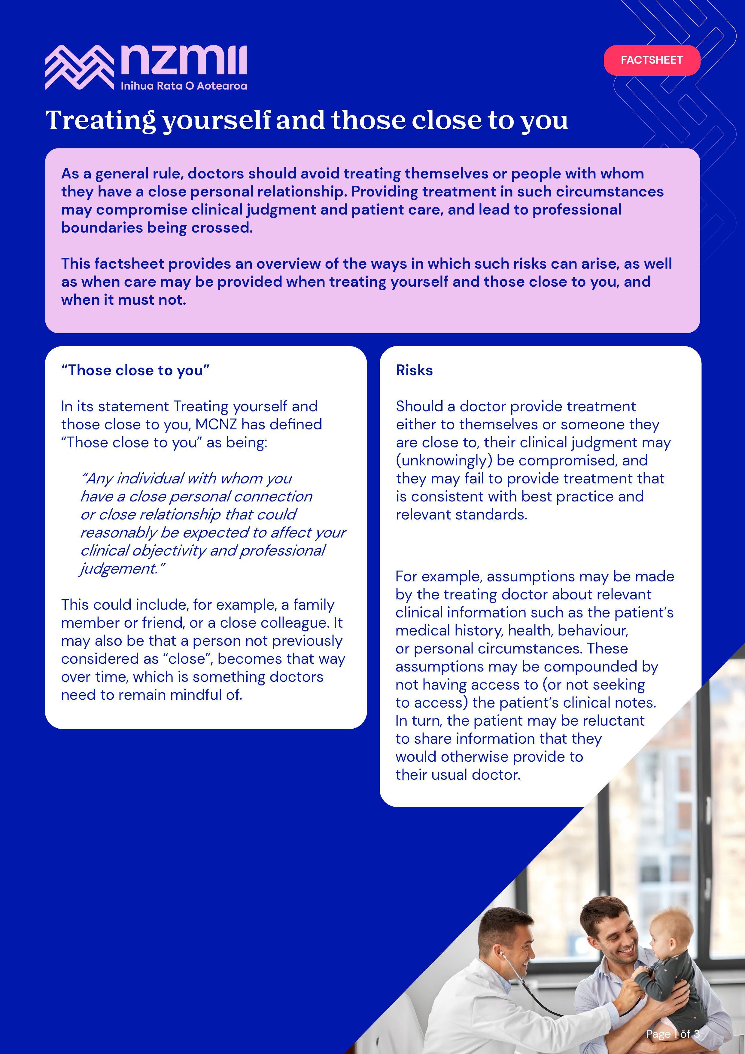 As a general rule, doctors should avoid treating themselves or people with whom they have a close personal relationship. Providing treatment in such circumstances may compromise clinical judgment and patient care, and lead to professional boundaries being crossed. This factsheet provides an overview of the ways in which such risks can arise, as well as when care may be provided when treating yourself and those close to you, and when it must not.